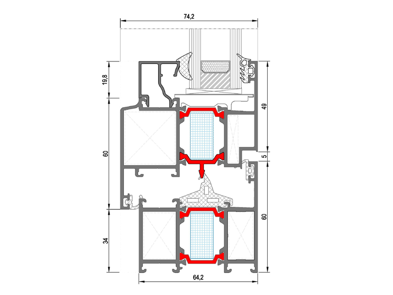 Doğrama Sistemi, 64 mm kasa derinliğine sahip olan özel yalıtımlı malzemeleri ile düşük Uf değerleri sağlayan ısı yalıtımlı alüminyum kapı ve pencere sistemidir. 74 mm kanat derinliği ve 1,6/1,8/2 mm et kalınlığına sahip profil seçenekleri mevcuttur.