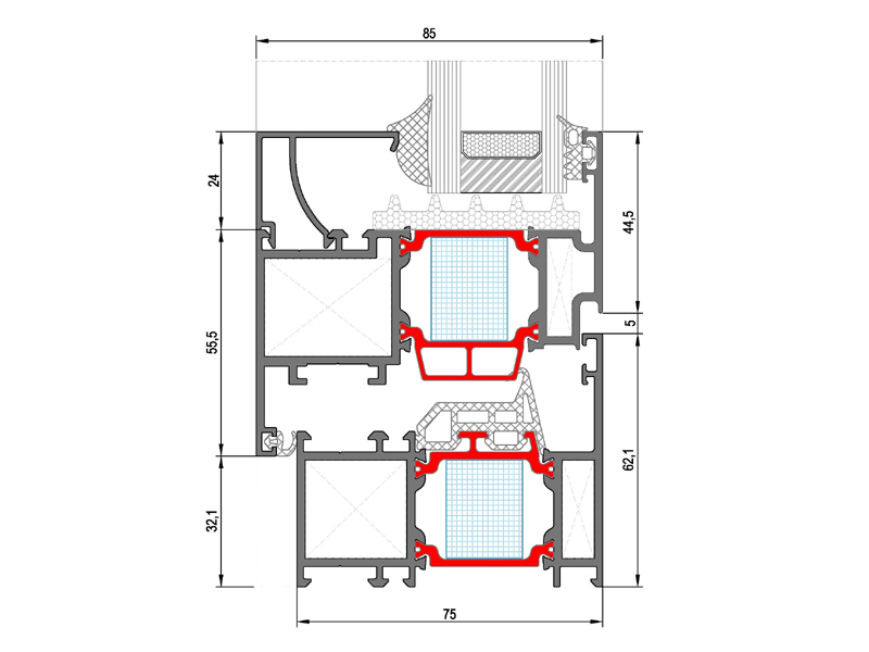 Özel yalıtım malzemeleri ile düşük uf değerleri sağlayan, yüksek ısı ve statik performanslı ısı yalıtımlı alüminyum kapı ve pencere sistemidir.75 mm kasa derinliği, 85 mm kanat derinliği; 2 mm ve 1,4 mm et kalınlığında profil seçenekleri mevcuttur.34 mm ısı bariyerine sahiptir.Normal açılım, çift eksen, vasistas, çekme sürme, pvc açılım aksesuarına uygun kanat alternatifleri mevcuttur. Isı yalıtım değeri (uf) 1,752 w/m2k dir.